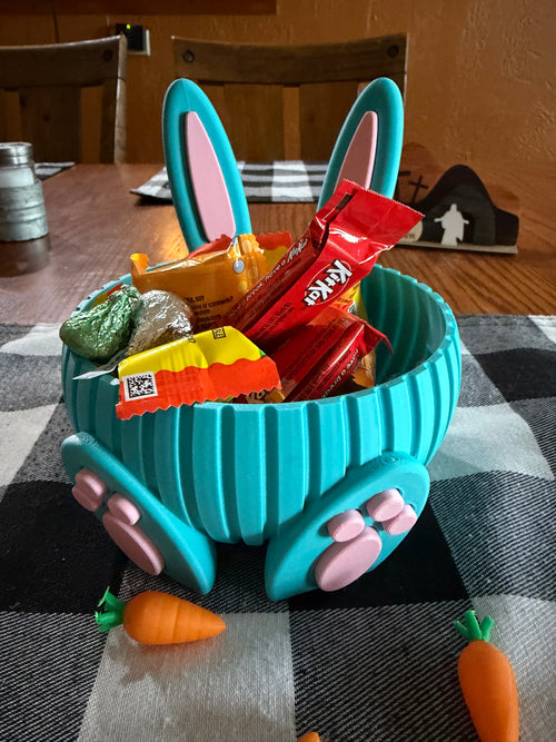 This cute Easter bunny basket is a decorative and practical bowl for Easter – perfect for chocolate eggs, small sweets, or as a lovely table and gift decoration. Measures approximately 5 1/2” x 5 1/2”.